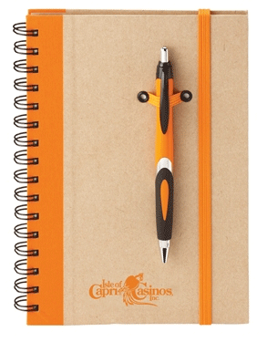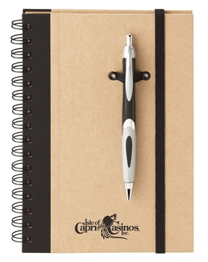 5 3/4" x 8 1/4" eco recycled notebook with pen combo. Ballpoint pen is made out of recycled paper and corn starch. Notebook is made out of cardboard with double spiral binding, elastic pen loop on cover and 80 white lined sheets. 70% recycled hard cover and 50% recycled interior.