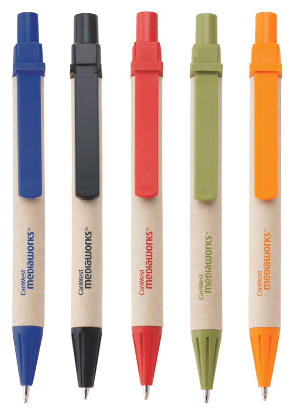 Eco push-action ballpoint plastic pen with recycled paper barrel and corn starch trim. Blue ink.